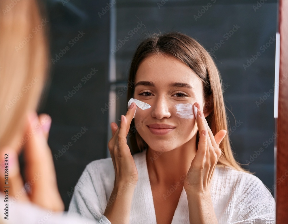 Obraz do Salonu Fryzjerskiego - Kobieta nakładająca krem pod oczy – codzienna pielęgnacja twarzy #1412860352