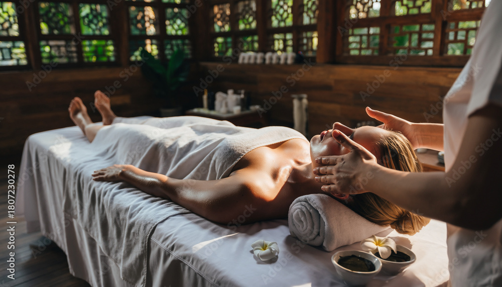 Obraz do Salonu Fryzjerskiego - Kobieta w salonie spa podczas masażu twarzy #1807230278
