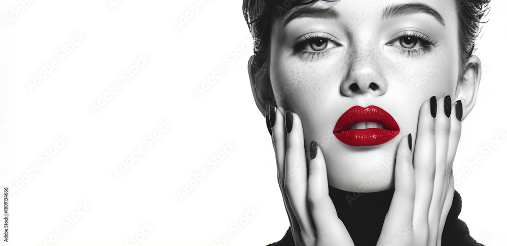 Obraz do Salonu Fryzjerskiego - Czarno-biały portret kobiety z czerwonymi ustami – nowoczesna fotografia fashion #1809134666