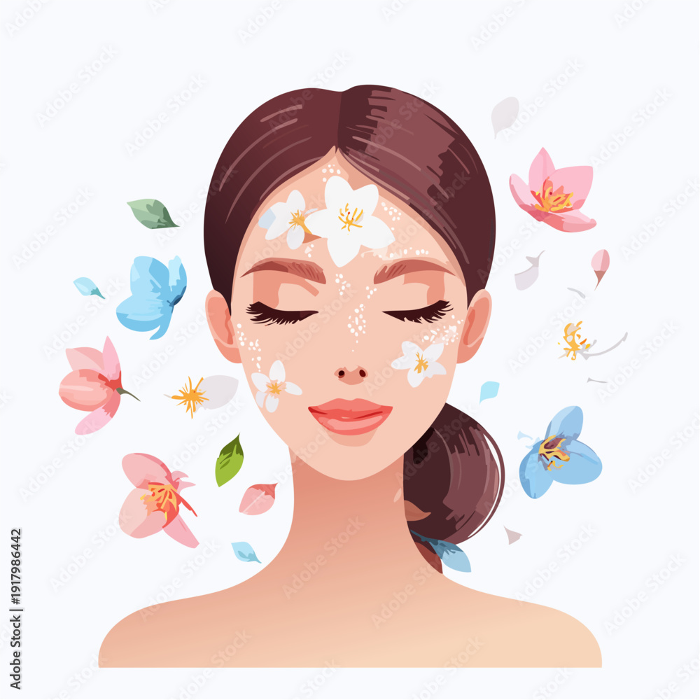 Obraz do Salonu Fryzjerskiego - Kobieta z kwiatową pielęgnacją twarzy, naturalna uroda i relaksujący zabieg kosmetyczny. #1917986442