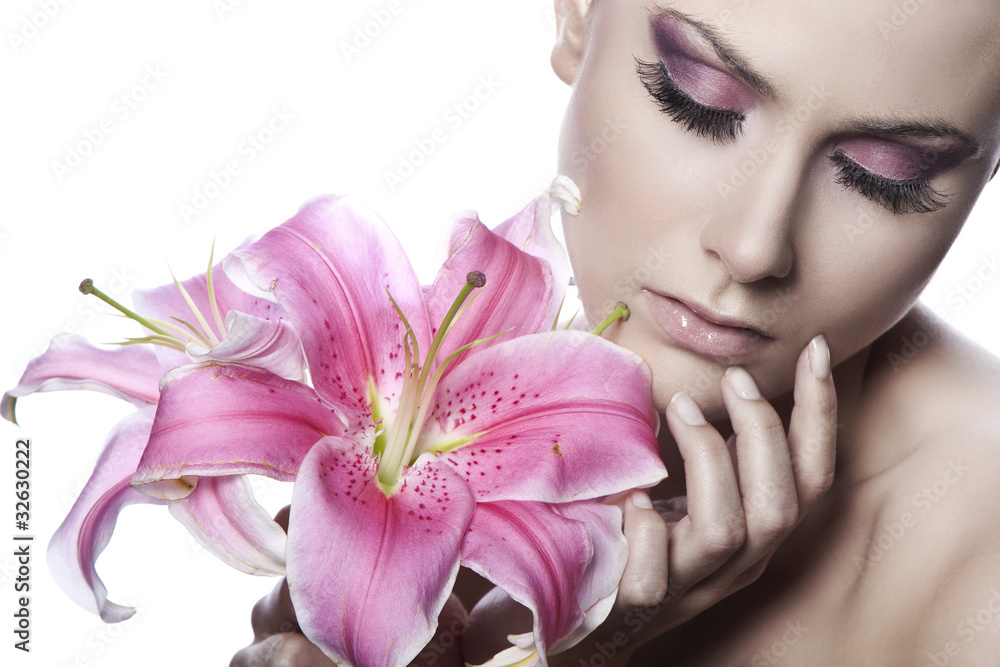 Obraz do Salonu Fryzjerskiego - beautiful young sexy woman with flowers on white background #32630222