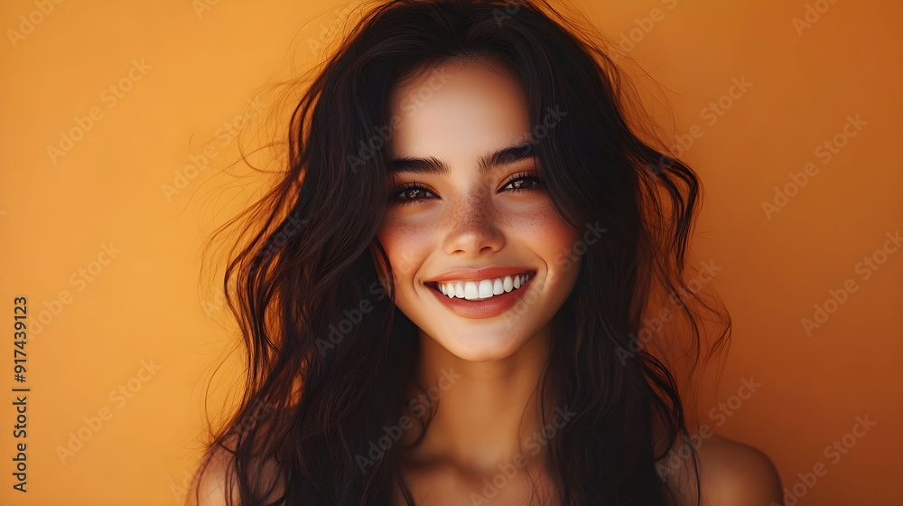 Obraz do Salonu Fryzjerskiego - europejska kobieta, faliste, czarne włosy, piękna, uśmiechnięta, wyrazisty makijaż, pomarańczowe... #917439123