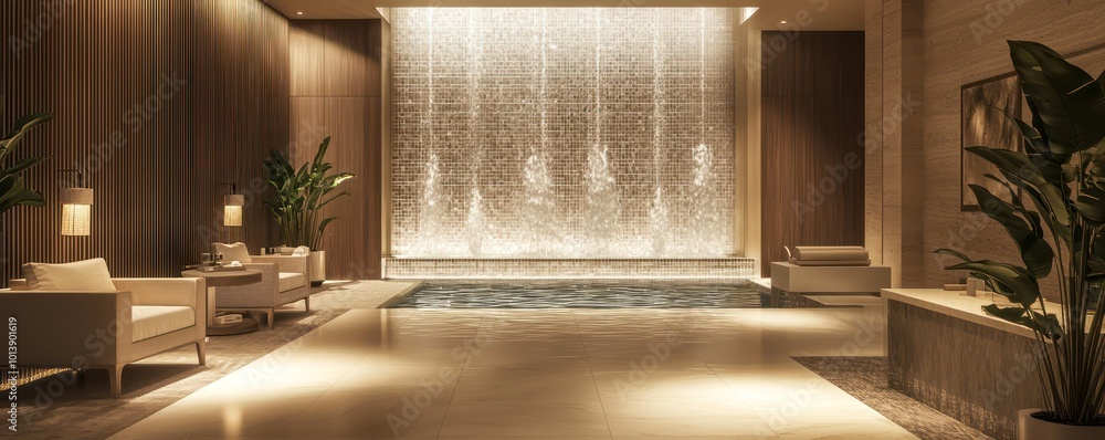 • A luxury spa reception with a calming water wall, elegant seating, and a serene palette of earth tones to welcome guests
