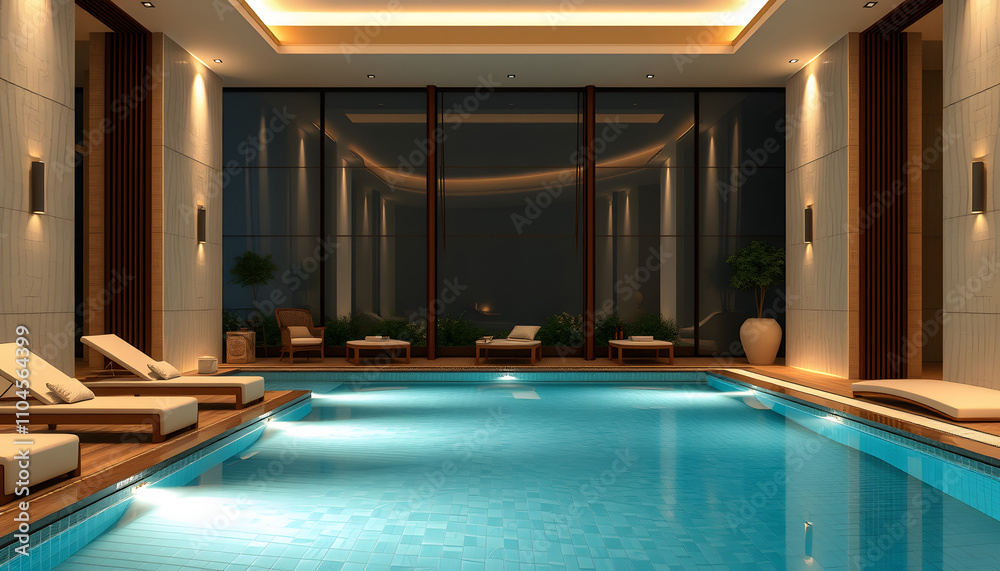 Obraz do SPA - View of loungers in spa room with swimming pool in hotel and wellness spa resort isolated with... #1104564399