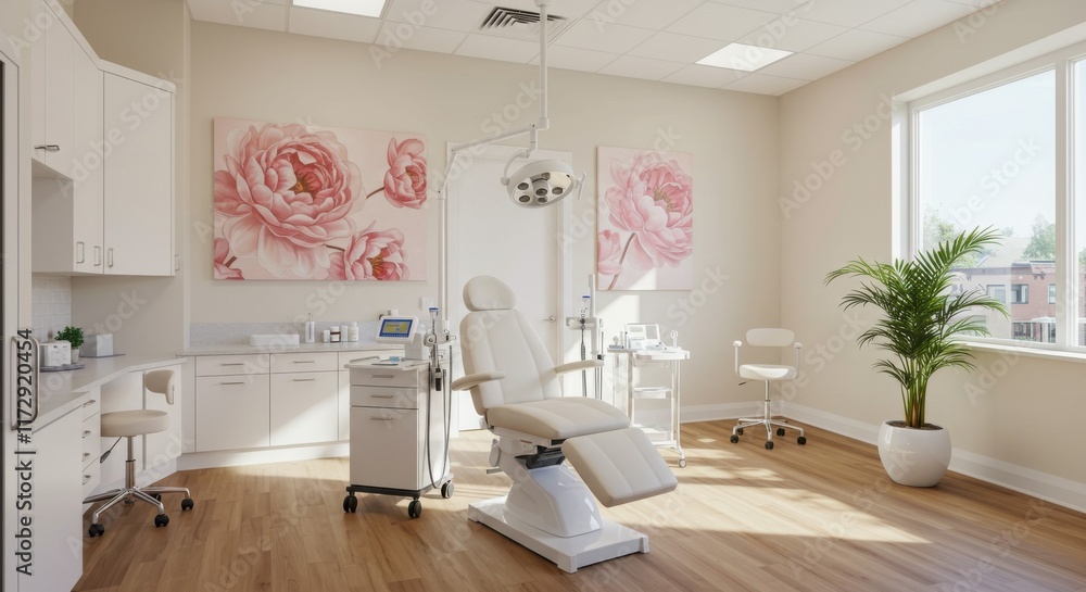 • Medical spa interior, luxurious treatment room, white and pink color scheme, floral wall art, modern dental chair, hardwood floors, bright natural lighting, minimalist design, clean aesthetic, potted