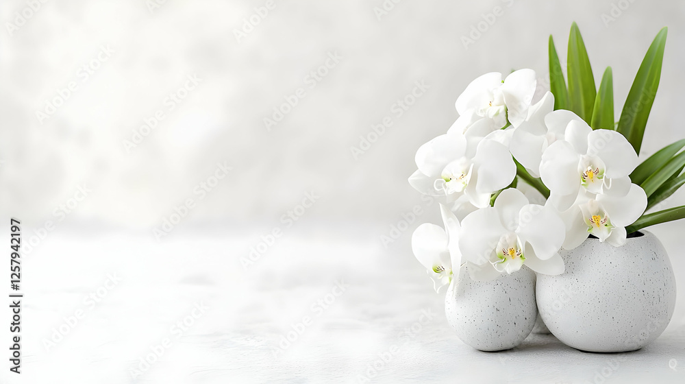 • White orchids in modern pots, serene background, spa setting, wellness imagery