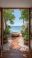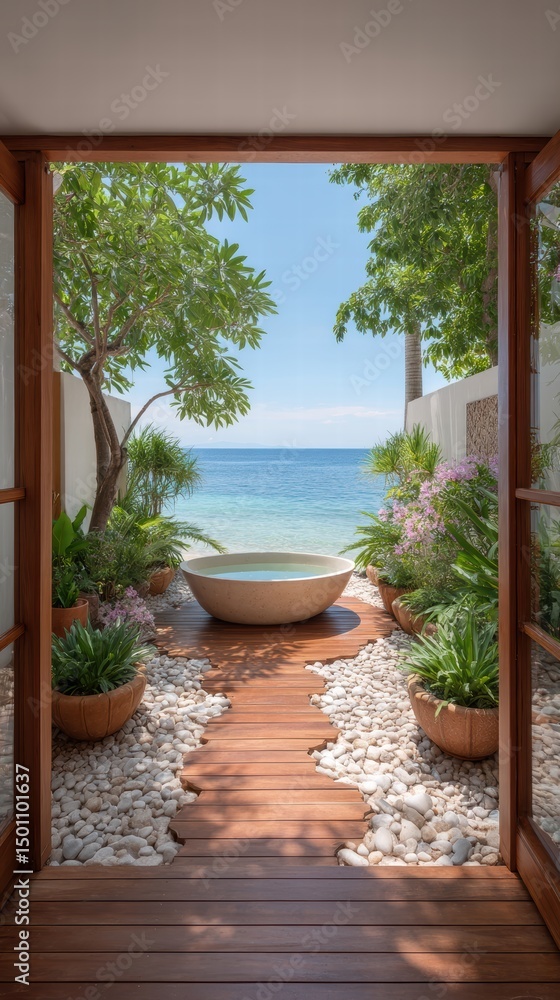 • Beach resorts oceanfront spa concept. Serene view of a tropical landscape through a wooden doorway, featuring plants and a tranquil water basin.