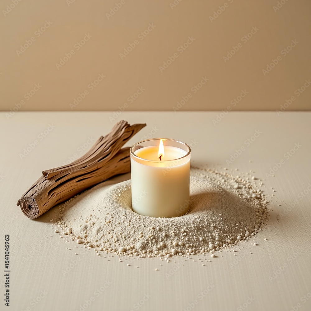 Obraz do SPA - A lit white candle sits on a mound of fine sand, accompanied by a piece of driftwood on a beige... #1541045963