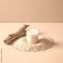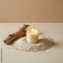 • A lit white candle sits on a mound of fine sand, accompanied by a piece of driftwood on a beige surface with a neutral background.