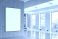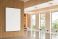 • Blank framed poster mockup in modern spa interior with wood panel wall and poolside lounge chairs in natural daylight backdrop. 3D Rendering