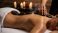 • Medium shot of a therapist placing hot steaming basalt stones on a woman's back for a relaxing massage in a spa with soft candlelight.