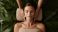 • spa, woman has a relaxing massage, dark beige colours, big green leaves, relaxing atmosphere, massage photograph in the background
