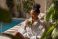 • Young black woman relaxing in bathrobe by indoor pool in luxury spa and drinking green smoothie