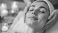 • Woman relaxing during facial spa treatment in autumn-themed room, self-care