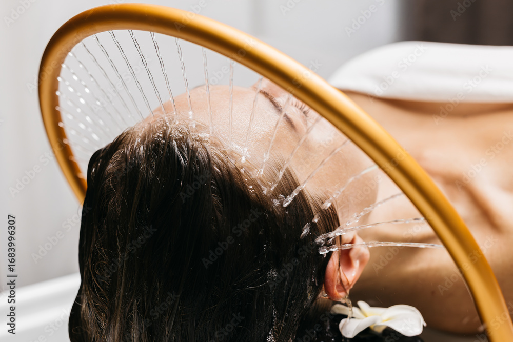 • Woman receiving hydromassage therapy with gentle water jets, relaxing in a serene spa environment, showcasing the soothing benefits of aqua massage and Japanese head spa techniques