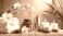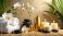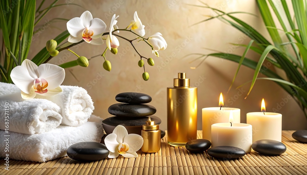 • A serene spa setting showcasing white orchids, luxurious towels, smooth stones, and warm golden tones.