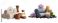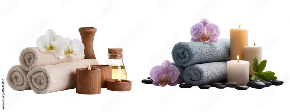 • a magnolite and grey towels with orchid, candle, pebbles on white background spa concept