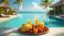 • Tropical paradise with tray of fruits drinks. Poolside scene with clear blue water, palm trees, sandy beach vacation holiday vibe. Sunny vacation mood, relax, spa resort, luxury travel.
