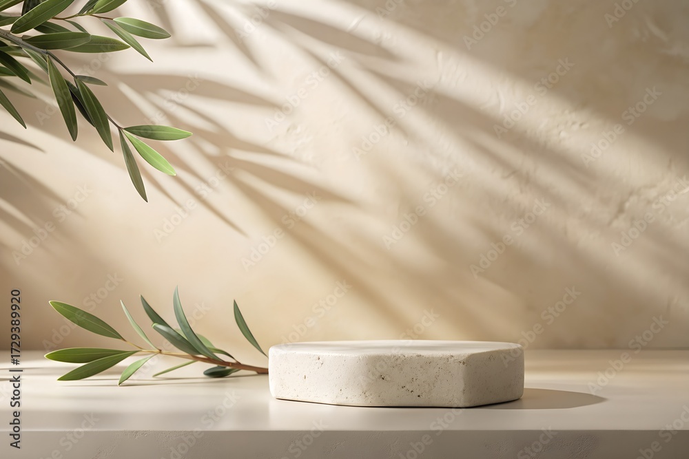 Obraz do SPA - Minimalist product showcase with olive branches and natural light casting shadows on wall #1729389920
