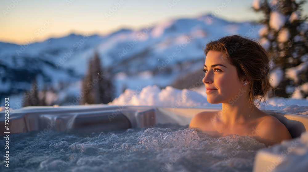 Obraz do SPA - Woman enjoying winter sunset in hot tub, snow around tub glistening, alpine peaks softly... #1732384372