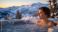 • Woman enjoying winter sunset in hot tub, snow around tub glistening, alpine peaks softly illuminated, steam rising from warm spa water creating relaxing winter vibe