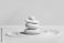 • Stack of spa stones on light sand against grey wall. Zen concept