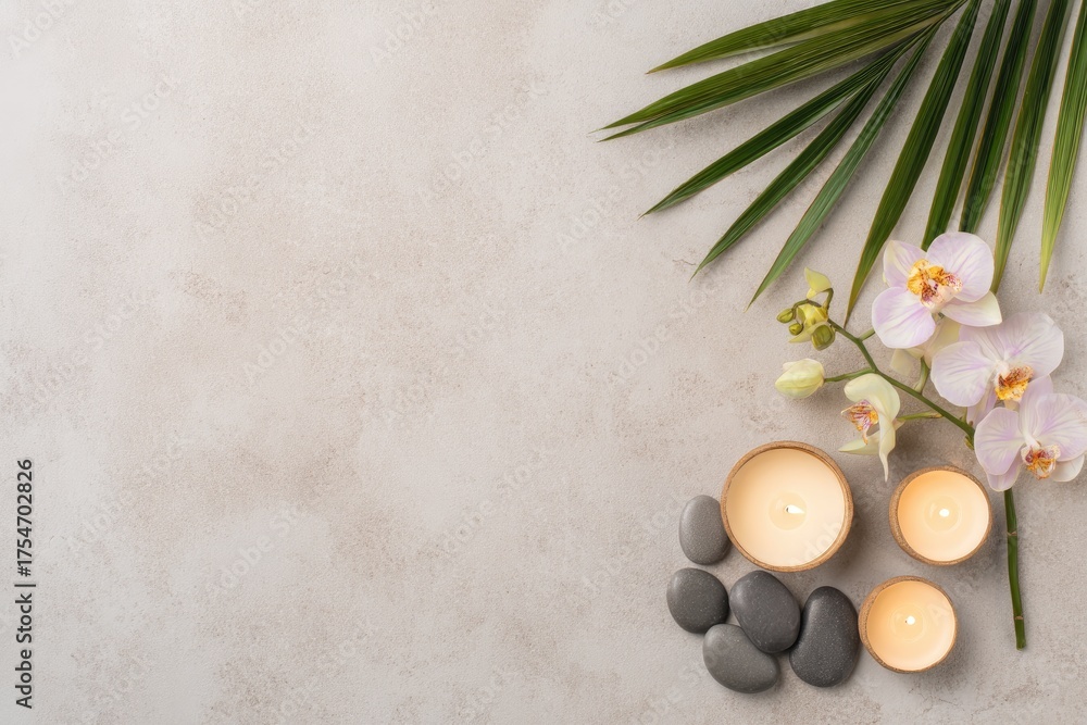 • Minimalist spa background with candles, gray pebbles, palm leaves, and orchids on light stone surface, ideal for wellness advertisements, relaxation themes, and beauty treatment designs