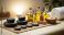 • Relaxing spa therapy setup with massage stones essential oils and towel