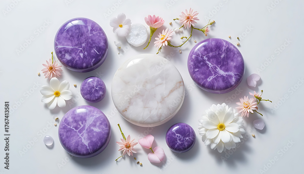 Obraz do SPA - Elegant Spa Composition with Zen Purple and White Stones and Delicate Flowers on White Background. #1767413581