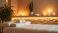 • Massage table with clean towels, lit candles in serene spa room. Soft ambient lighting creates tranquil atmosphere for relaxation, wellness treatments. Plants add natural decor to peaceful setting.