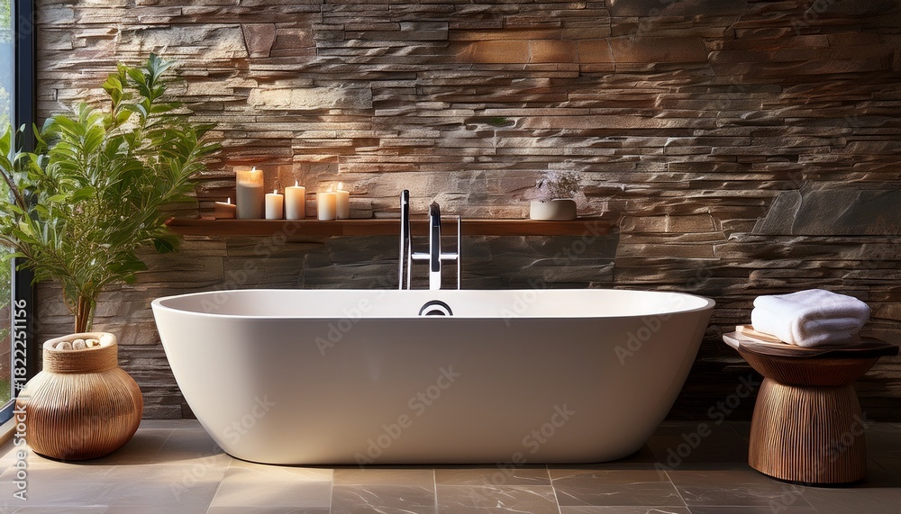 Obraz do SPA - a serene bathtub scene highlighting elegant bathroom fixtures and natural stone walls for a... #1822251156