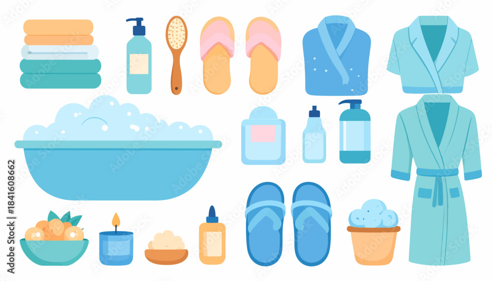 • A collection of bath and spa items including a tub, towels, bathrobes, and toiletries for personal care.