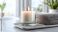 • Soothing scented candle burns beside soft folded towels creating a tranquil spa atmosphere indoors