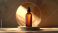 • Amber glass spray bottle on a pedestal, illuminated by soft sunlight