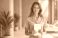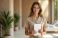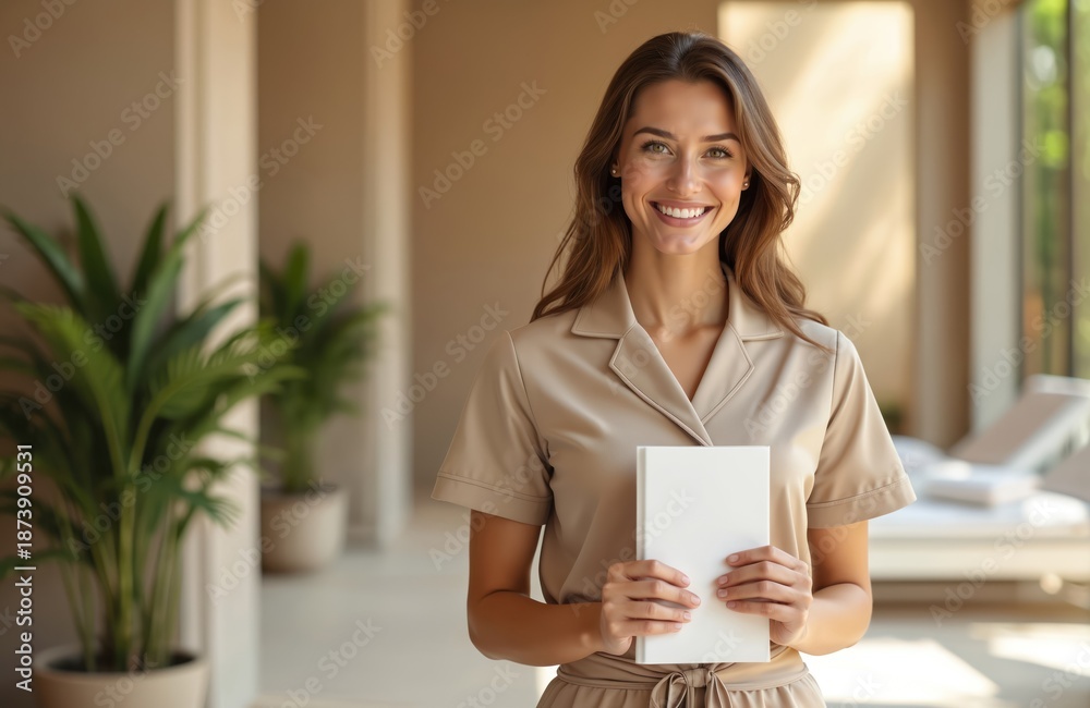 • Smiling spa employee in uniform holds menu. Woman in luxury wellness center. Happy female at work. Person with book in hands. Professional in beauty parlor workplace. Calm zen interior design.