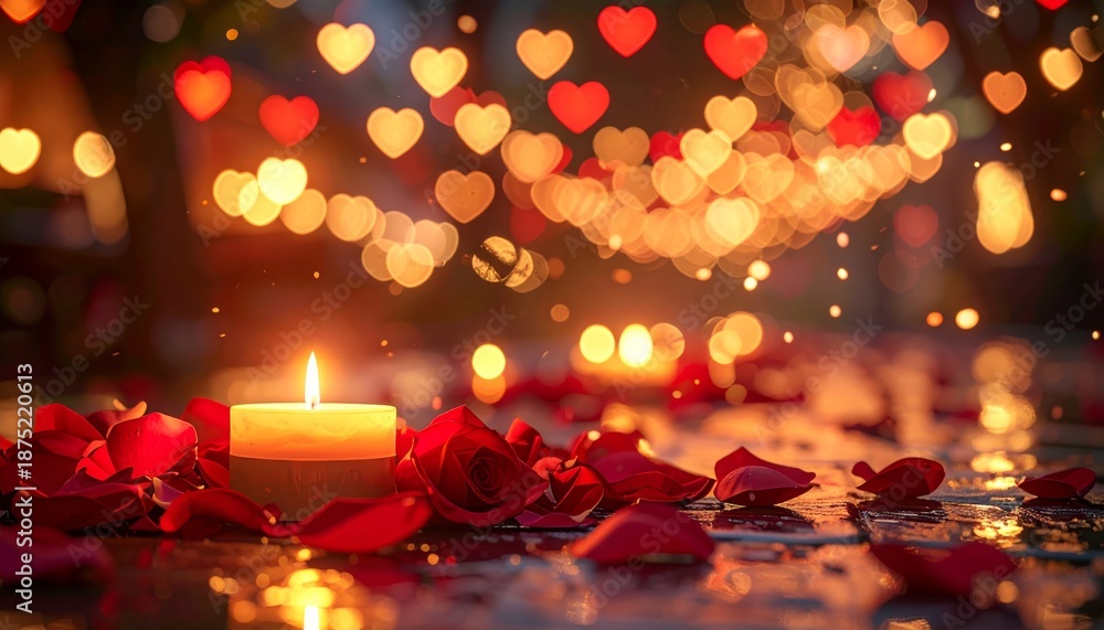• Abstract illustration of red rose petals and heart-shaped candles for Valentine's Day