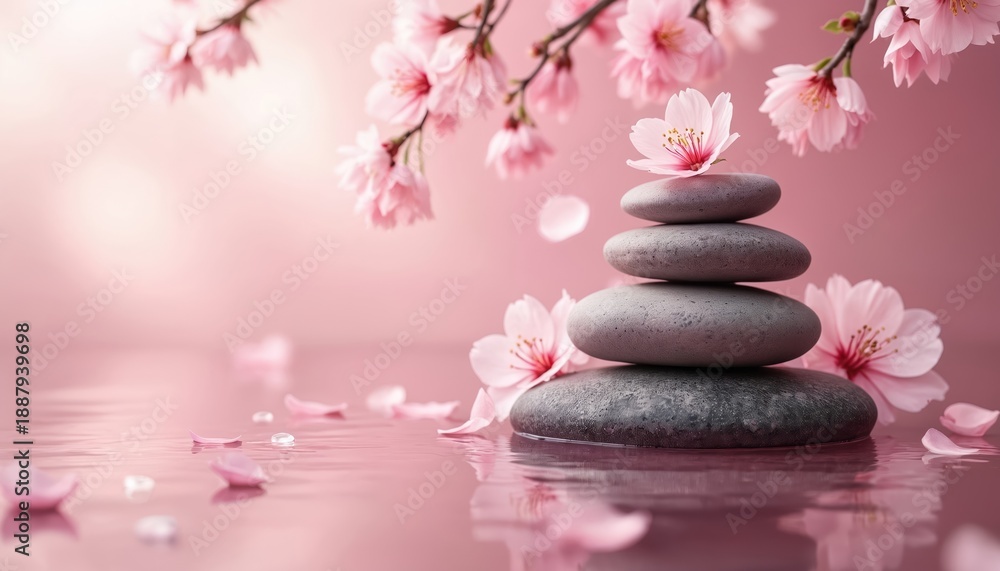 • Stack of zen balance stones with pink cherry blossoms reflected on wet surface. Peaceful spa scene with delicate petals floating on calm water. Serene springtime beauty promoting relaxation, well.