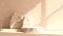 • Minimalist scene with rough stone podium, rocks on light gray concrete wall background. Soft shadows from sunlight create natural, organic, spa ambiance. Stone platform suitable for product display,