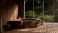• Beautiful and luxury Onsen spa room in Japanese style with wood bath against the glass wall
