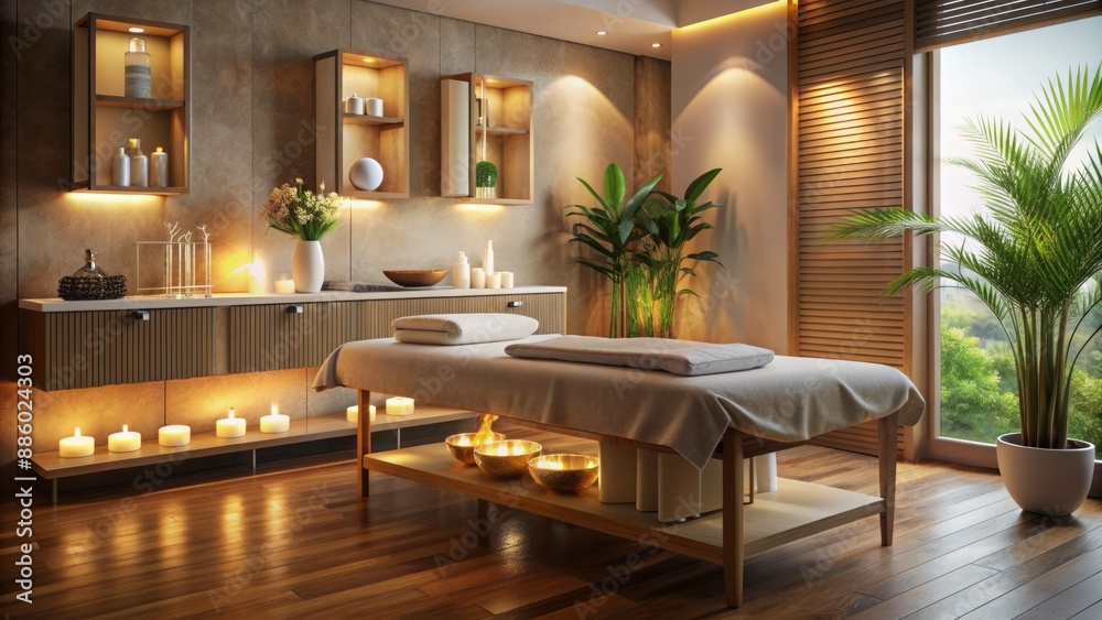 Obraz do SPA - Serenity surrounds a vacant spa room with soft lighting, massage table, and beauty treatment... #886024303