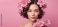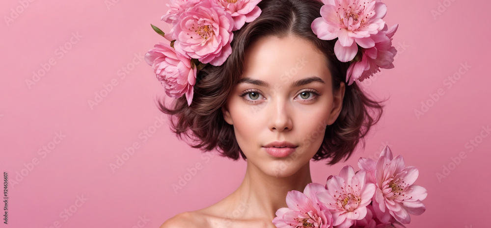 • Close-up portrait of a woman with pink flowers, set against a matching pink background, embodying beauty and femininity.