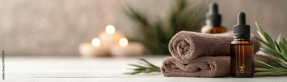 Obraz do SPA - Essential oils and spa tools in calm setting close up, focus on, copy space, tranquil color... #928153216