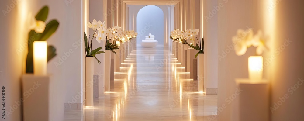 Obraz do SPA - Elegant spa corridor with fresh orchids, soft lighting, and marble floors, representing... #964655959