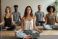 • A group of diverse individuals are meditating together in a serene yoga studio. The peaceful atmosphere and focused expressions emphasize mindfulness and tranquility.