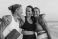 • Friends enjoying a sunset yoga session on the beach embracing wellness