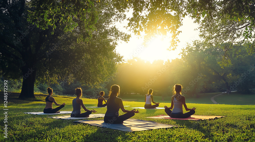 Obraz do Szkoły Jogi - Yoga classes. Yoga in nature. Yoga in the park at dawn, women doing exercises sitting in the... #1248572292