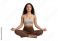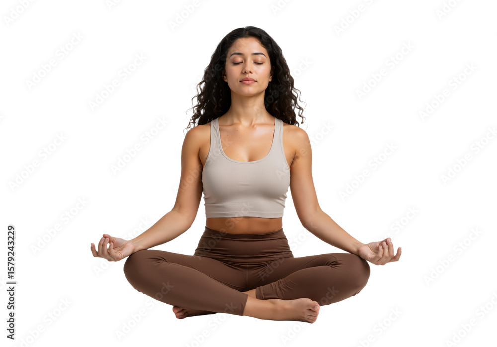 • Woman meditating in lotus position, eyes closed, peaceful expression, casual yoga outfit, white background, PNG format