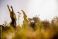 • Four young women are practising yoga in the open air in the nature on the grass on the sunny day
