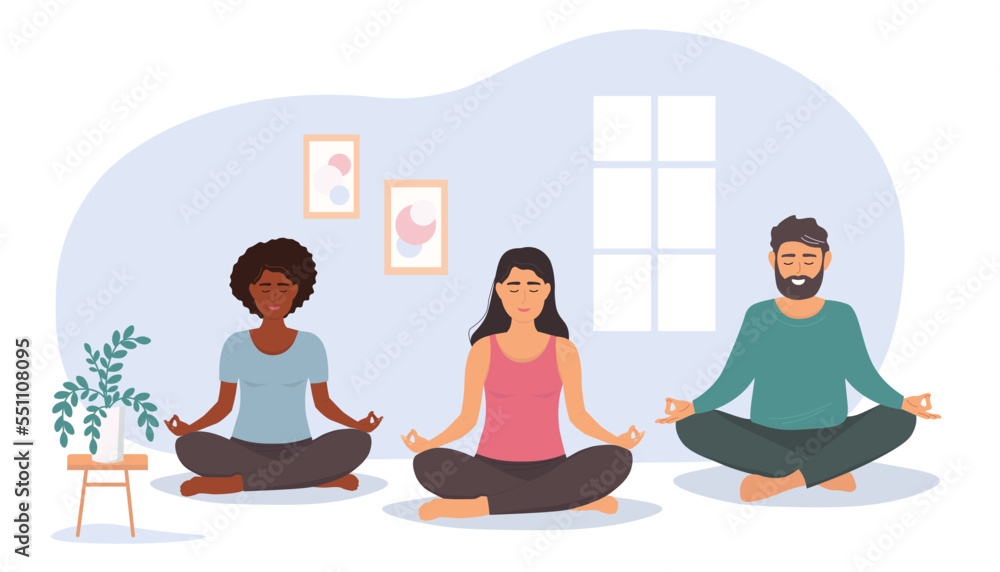 Obraz do Szkoły Jogi - A group of people is doing yoga, meditating in the hall. A woman and a man do gym synchronously.... #551108095