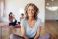 • Smiling Mature woman meditating sitting in a yoga studio. Generative AI